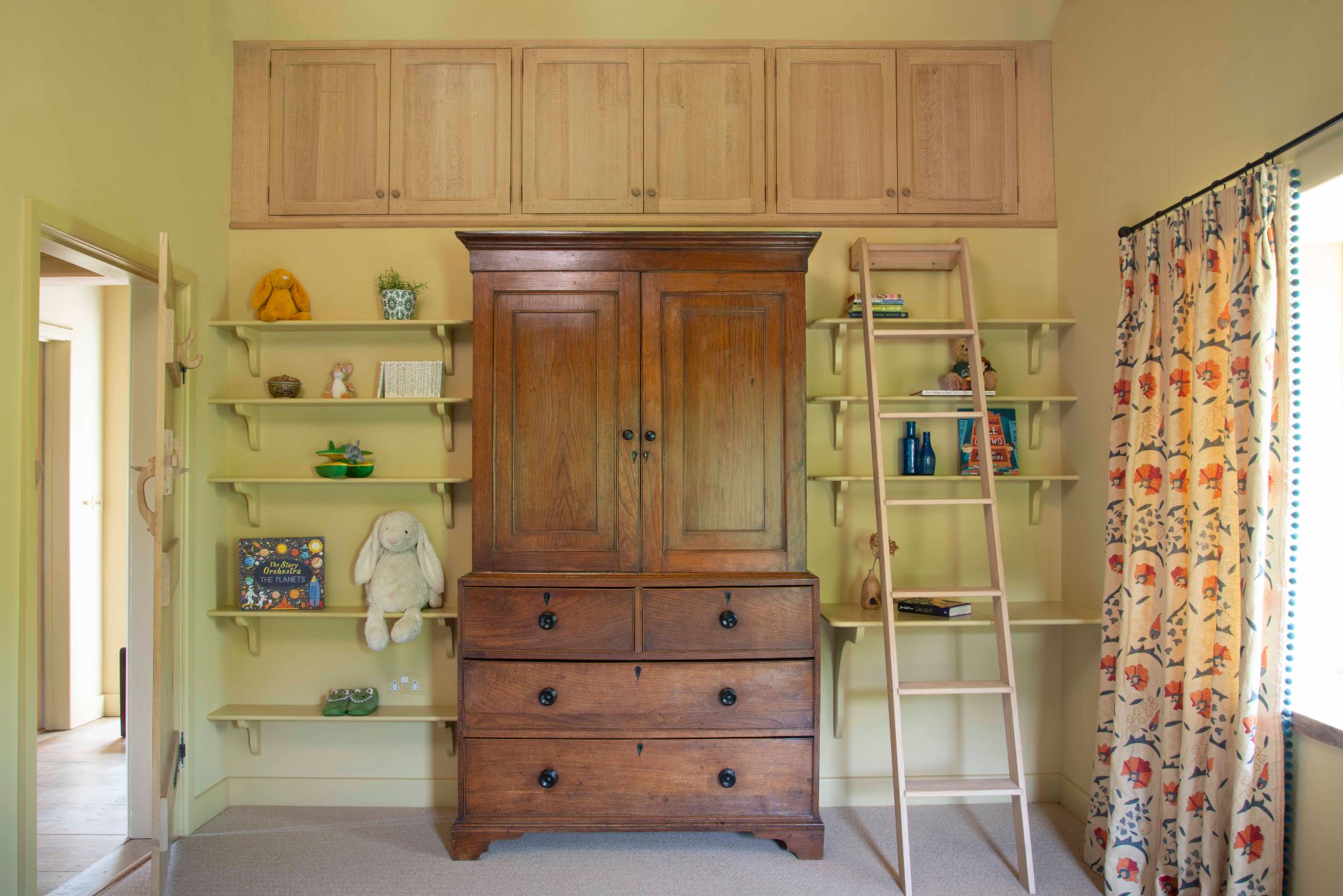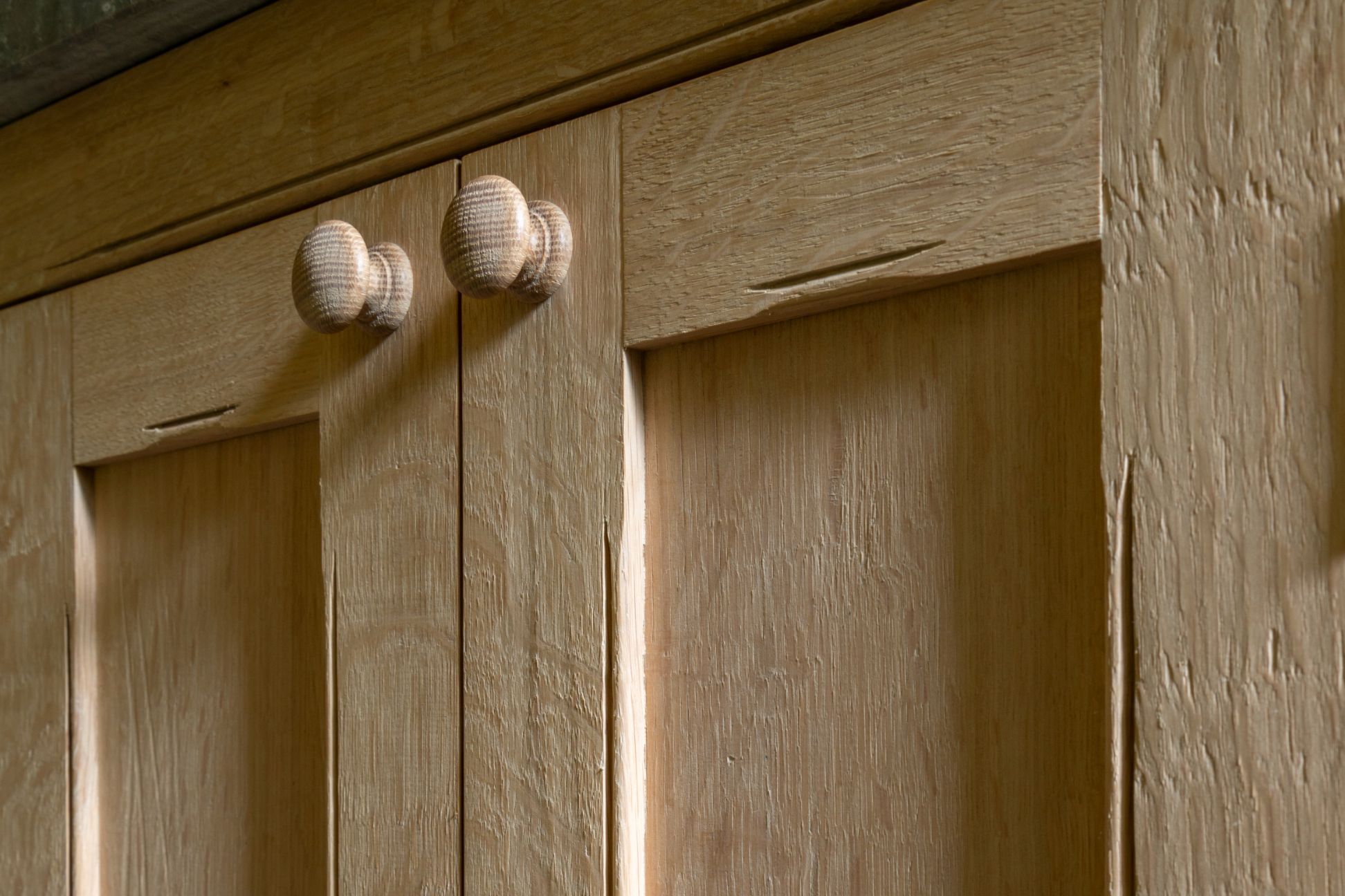This children's bedroom was built with high level cubbyholes, for occasional access. We created the cupboard doors and frames to reflect the traditional furniture that we made for other rooms in this historic farmhouse renovation. Hand-planed, quarter-sawn English oak, with hand-worked details. The...